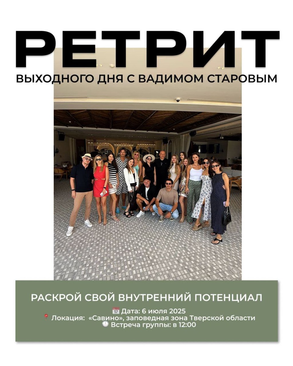 🌿 РАСКРОЙ СВОЙ ВНУТРЕННИЙ ПОТЕНЦИАЛ 🌿 Ретрит выходного дня с Вадимом Старовым 📅 Дата: 6 июля 2025 📍 Локация: «Савино», заповедная зона Тверской области 🕛 Встреча группы: в 12:00 Приглашаем тебя на трансформационный уикенд-погружение в природу, тело и сознание. Это не просто мастер-класс — это мощная перезагрузка и исследование твоих глубинных возможностей. Что тебя ждет: • Природный детокс: Пробежки к святому источнику в тишине соснового леса • Тело и энергия: Практики Цигун и йога в потоке • Путь силы: Фехтование на шпагах и палках — как путь фокусировки и баланса • Психотехника: Управление вниманием, гипноз и основы НЛП • Выход за пределы: Хождение по углям, муравьиные ванны и работа со страхом • Ритуал очищения: Походная баня у реки и энергетические практики • Трансформационная игра и медитация у костра • Домашняя кухня: Шурпа, приготовленная на огне, и живой ужин под звёздами Это пространство для: • Осознанности и внутреннего пробуждения • Телесных инсайтов и м