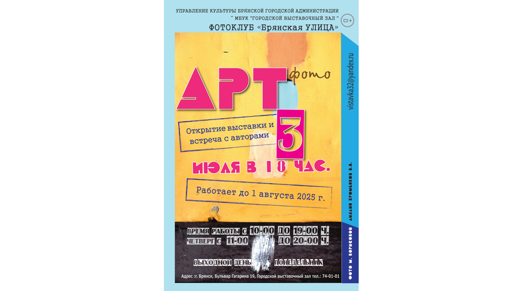 В четверг, 3 июля, в Городском выставочном зале откроется выставка «Арт-фото». Её представит фотоклуб «Брянская улица». Главная тема экспозиции – искусство («арт» в переводе с английского). Посетители увидят работы, в которых главным является оригинальное художественное видение фотографа, а не точная констатация факта с помощью фотокамеры. В этому ряду – серия работ Ларисы и Александра Березуцких «Игры воображения». Авторы, влюбленные в природу России, нашли свои сюжеты в лесу. А Тамара Цилиакус – в чаепитии, которое вызывает ассоциации со сказочным чайным столом в «Алисе в стране чудес». Владимир Хроменков представил серию на сложную философскую тему – «Возвышенное и земное». Наталья Книжникова нашла вдохновение в «Одуванчиковых экзерсисах». Всего на выставке представлено 53 работы 13 фотографов. Открытие состоится в 18:00 3 июля. Заглянуть на выставку можно по 27 июля. 0+ Жителей Брянска приглашают на выставку арт-фотографий