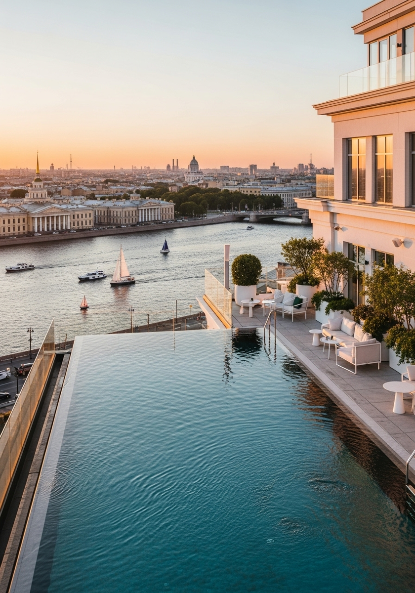 - Какие отели с бассейном предлагают лучшие виды на город? Отель Санкт-Петербург на Пироговской набережной и SO/ St. Petersburg с террасой на крыше открывают потрясающие панорамы города.