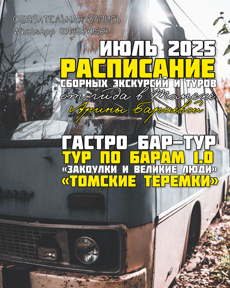 Каждая экскурсия и тур могут быть проведены в индивидуальном формате и есть подарочные сертификаты на сумму/тур. Сайт с моими экскурсиями: https://guidetomsk.ru/ *** 18.07 ПТ 19:30 "ТОМСКИЕ ТЕРЕМКИ" Прогулка по дивному району с деревянными домиками - фишкой Томской архитектуры. Фотогеничная и красивая, изучим резьбу, символы, узнаем о жителях домов. Гостям Томска и жителям. 1000 вз/400 дет 1.45 ч. Пешая *** 19.07 СБ 18:00 ГАСТРО БАР-ТУР Три бара: стильная сидрерия, гастро-бар в старинном доме, питерская-неорюмочная. Дегустация напитков, закуски, изучаем фуд-пэйринг, играем и знакомимся! 2700 р/чел (вкл. закуски, напитки, такси) 2,5 ч, кол-во мест ограничено можно забрать тур под индивидуальное мероприятие *** 26.07 СБ 18:00 ТУР ПО БАРАМ 1.0 4 бара разного формата от Мексики до Европы, новые знакомства, игры, велком-дринки, выберем BIG-босса баров! 2400 р/чел (вкл. напитки, такси) 2,5 ч, кол-во мест ограничено можно забрать тур под индивидуальное мероприятие *** 27.07 ВС 11:00 "ЗАКОУЛК
