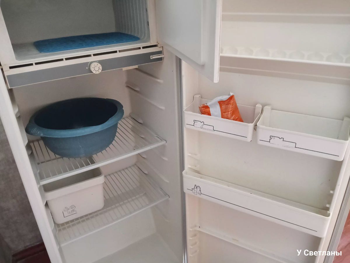 Первым делом мы убрали всё содержимое холодильника и разморозили его.