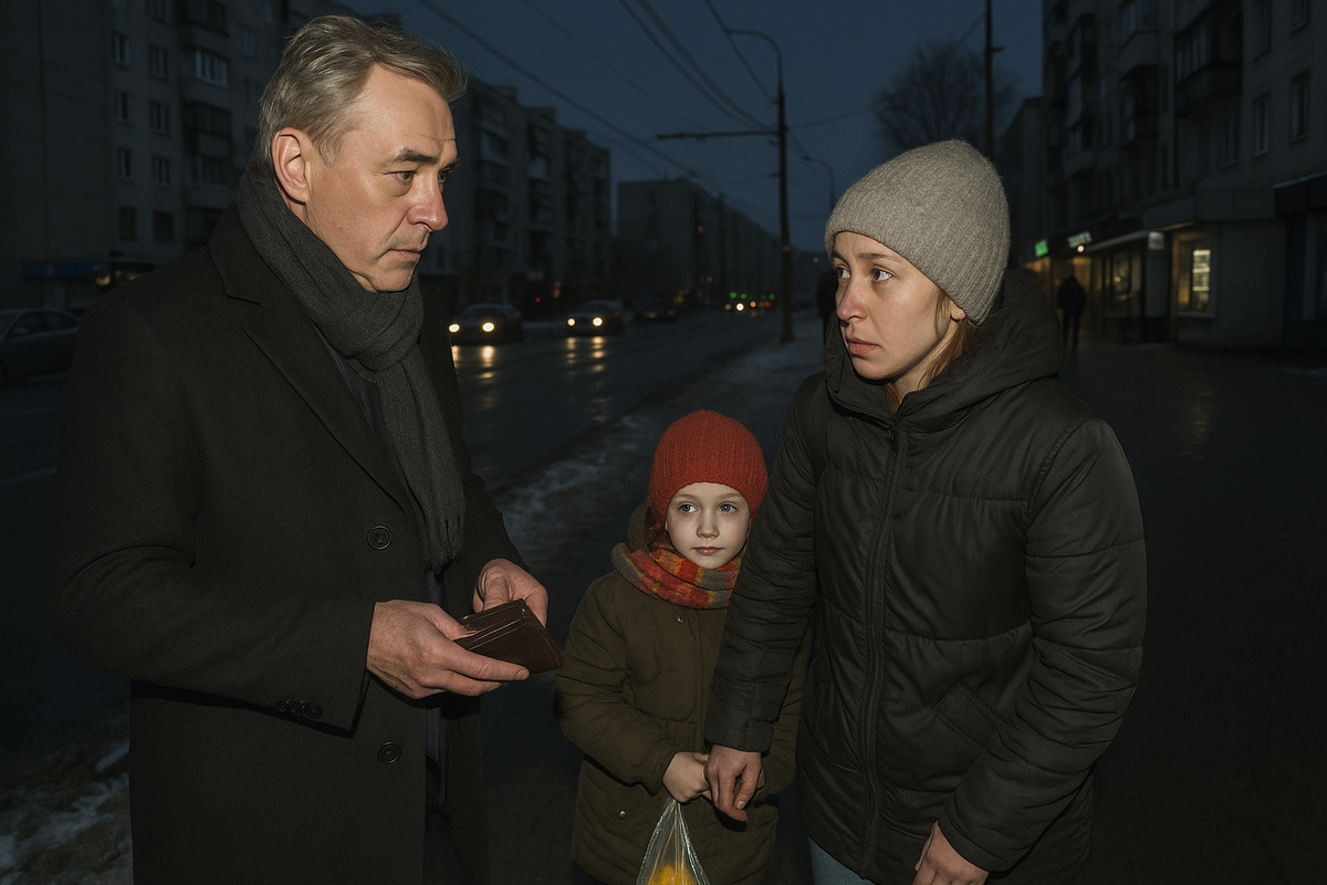 К нему подошла молодая женщина с ребёнком. Лет тридцати, но выглядела старше — лицо осунувшееся, одежда чистая, но заношенная. Девочка лет семи держалась за её руку.