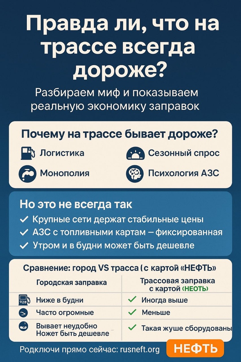 📉 Правда ли, что на трассе всегда дороже? Разбираем миф и показываем реальную экономику заправок ⛽️🛣 Старый как асфальт миф: "На трассе — дороже. Заправляйся в городе!" Но если бы всё было так просто, никто бы не тратил миллионы на развитие сетей вдоль М-4, М-7 и М-11. Разберёмся: когда трасса — это дорого, а когда наоборот — выгоднее. 🧾 Почему на трассе бывает дороже? Логистика — доставить топливо в чистое поле стоит дороже. Монополия — если ты одинокий дальнобой в 3 часа ночи, ты не выбираешь. Сезонный спрос — летом и в выходные ценник может прыгать вверх. Психология АЗС — “куда ты денешься, у тебя мигает лампочка”. 📉 Но это не всегда так ✔️ Большие сети (Лукойл, Роснефть, Газпромнефть, Татнефть) держат стабильные цены, вне зависимости от "город/трасса". ✔️ АЗС с топливными картами, особенно картой "НЕФТЬ", работают по фиксированной или скидочной цене — хоть в Москве, хоть на трассе между Пензой и Уфой. ✔️ Утром и в будни цена на трассе может быть ниже, чем на популярны