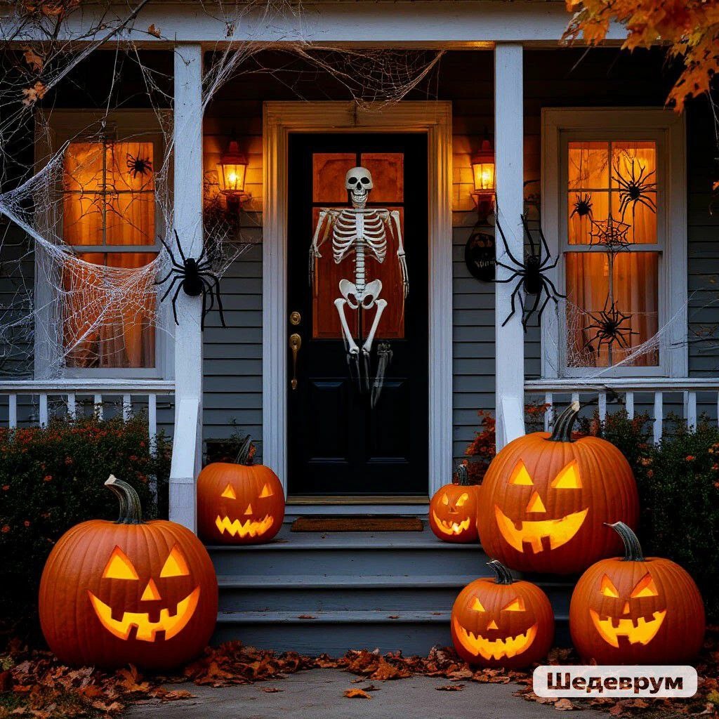 К вечеру на крыльце появились среднего размера тыквы с прорезанным ртом, на входной двери повис скелет с серпом из картона, а на нижних
