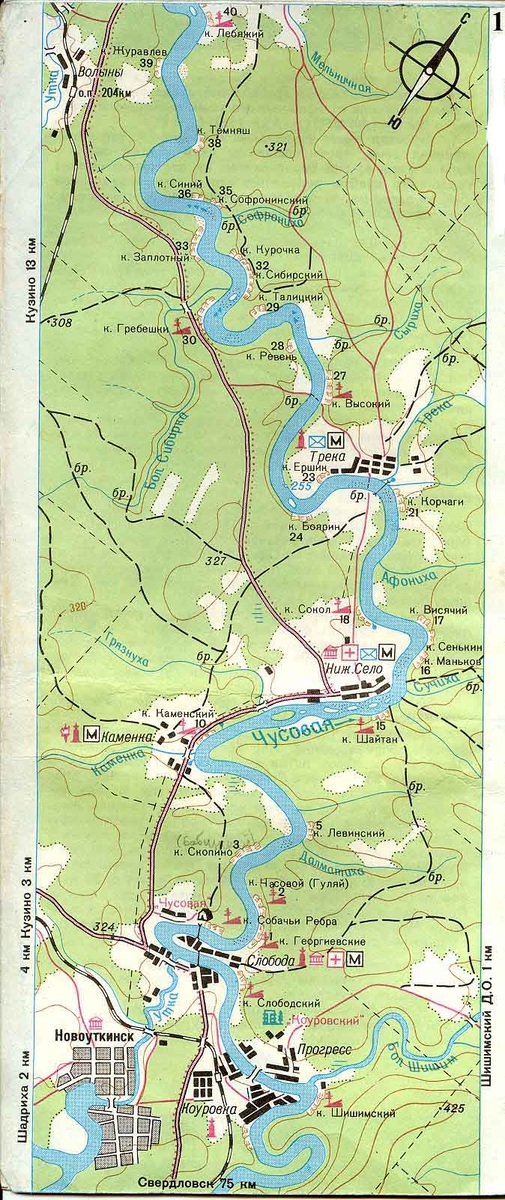 Нашёл старую карту, вдруг кому-то надо: смотрите, скачивайте, печатайте. Обозначения километража старые. Будет время — отсканирую свою карту: она более подробная, но по компактности старая лучше, всего — восемь страниц. 1. Коуровка — Нижнее Село — Трека — камень Лебяжий Обратите внимания на камень Скопино. На старой карте его подписали карандашом как камень Бобинский первоначально назывался Скопино от слова скапливаться. Такое название возникло по причине того, что весной на мели у камня образовывались заторы из льдин и всякого мусора. Возникшие неожиданно на повороте заторы могли представлять опасность для барок. В связи с этим отмель была взорвана и расчищена. Когда заторы из льда и мусора перестали здесь образовываться, то и камень вскоре сменил название со Скопино на Бобинский. Итак, вернёмся к карте. 2. Камень Лебяжий — Староуткинск — Мартьяново 3. Мартьяново — Сулём — камень Толстик 4. Усть-Утка — Харёнки — камень Журавлик 5. Камень Журавлик — Кын — Верхняя Ослянка — камень
