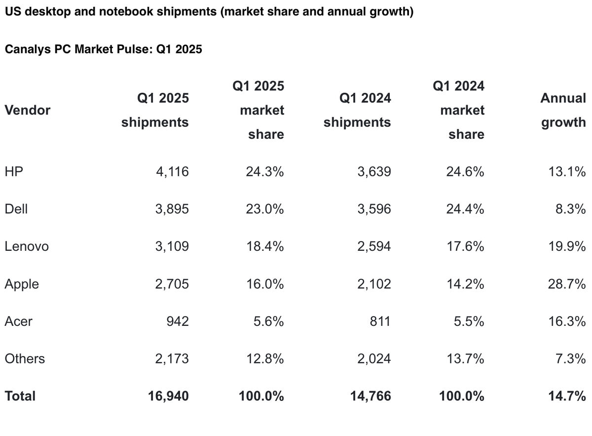 Общий объем продаж настольных компьютеров и ноутбуков в США достиг 16,9 миллиона устройств в первом квартале 2025 года — на 15% больше, чем годом ранее. Apple реализовала 2,705 миллиона устройств против 2,102 миллиона в аналогичном периоде 2024 года. Этот результат превзошел показатели китайского производителя Lenovo (+19,9%) и значительно опередил американские компании Dell (+8,3%) и HP (+13,1%). Среди пяти крупнейших поставщиков только Apple смогла нарастить долю американского рынка более чем на 1,5 процентных пункта за квартал.