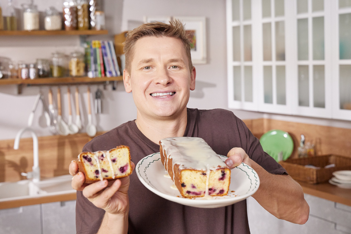 Ингредиенты: Мука — 280 г Разрыхлитель — 5 г Яйца — 3 шт. Сахар — 180 г Натуральный питьевой йогурт — 400 мл Сливочное масло — 200 г Апельсин (цедра и сок) — 1 шт. Имбирные цукаты — 60 г Чёрная смородина замороженная — 150 г Сахарная пудра — 40 г Соль — щепотка Приготовление: 1. Сливочное масло размягчить или слегка растопить, цукаты нарезать мелкой соломкой. 2. Взбить яйца с сахаром и щепоткой соли до пышной пены, постепенно влить масло и йогурт, продолжая взбивать. 3. Муку смешать с разрыхлителем, добавить частями в яичную смесь, перемешать миксером и лопаткой. Натереть цедру апельсина, добавить цукаты и замороженную смородину. 4. Смазать форму маслом, посыпать мукой, вылить тесто и выпекать при 160°C около 50-55 минут. 5. Остывший кекс смазать глазурью из сахарной пудры и апельсинового сока, нарезать на порционные куски. Приятного аппетита!