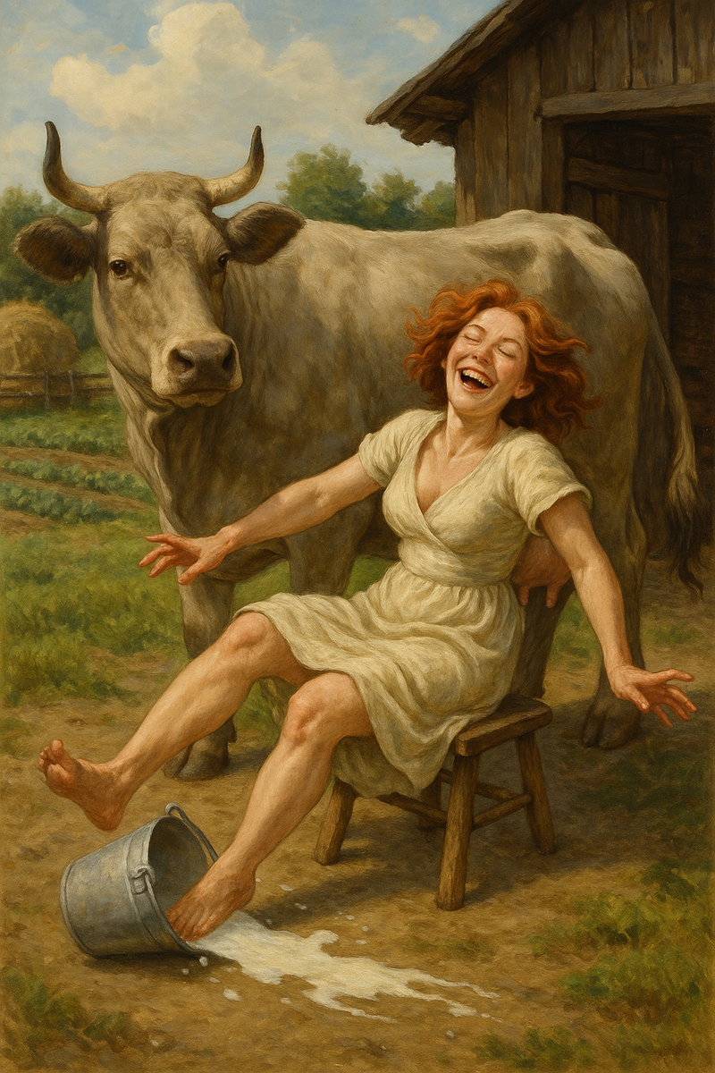 Я всегда боялась больших животных. Нет, не то, чтобы «ай, страшно», а именно до озноба в пятках. Чем больше живое существо — тем больше мой внутренний голос кричал: «Беги!». И Дуся — наша корова, 500 килограммов живого веса, хромого взгляда и своенравного нрава — была для меня как натуральный квест на выживание. Прошел месяц с момента её появления в нашем сарае, а я до сих пор к ней подходила только с почтительного расстояния и то если муж ее привязал. Но однажды проснулась я с мыслью: «Я что, не человек, что ли? Я умнее коровы! Я — Блохер… то есть, блогер! Я должна!» Подошла к Сергею и выдала боевой план: — Я сегодня её дою. Но! Стоишь рядом. Руководишь. Если что — спасаешь. Взяла камеру, включила съёмку, нацепила микрофон и пошла в сарай как на съёмки собственного ток-шоу «В гостях у страха». Дуся стояла, жевала. Сергей уже рядом, спокойно, как будто мы тут кофе пить собрались. — Дам ей комбикорма, — говорит, — она тогда минут 10 ест и стоит. Успевай. Потом начнёт крутиться — и держи