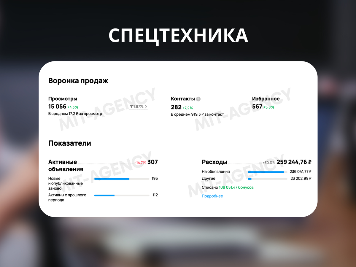 Всем привет! Мы - MIT Agency. Уже 5 лет помогаем компаниям привлекать клиентов через Авито. Сегодня делимся результатами одного из наших постоянных проектов в нише спецтехники. ⏳ Время чтения: 5 минут Работаем с этим клиентом уже более полугода: постоянно корректируем стратегию продвижения, подключаем аналитику, тестируем разные подходы. Делимся результатами за разные периоды работы 👇 У клиента - десятки единиц техники на складе.
