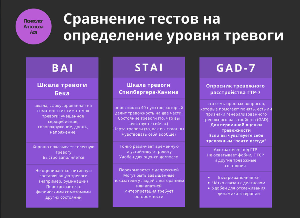 «Мне всё время тревожно. Но я не могу понять — это просто усталость? Или уже тревожное расстройство?..» Знакомо? Если да — вы не одиноки. Миллионы людей по всему миру пытаются разобраться в себе, и всё чаще для этого используют научные опросники по тревоге. Они помогают взглянуть на своё состояние чуть яснее — не через «я просто загоняюсь», а через объективные признаки. Сегодня расскажу о трёх шкалах, которые чаще всего используются в психологии: Иногда тревога проявляется очевидно: сердце стучит, ладони потеют, мысли скачут.