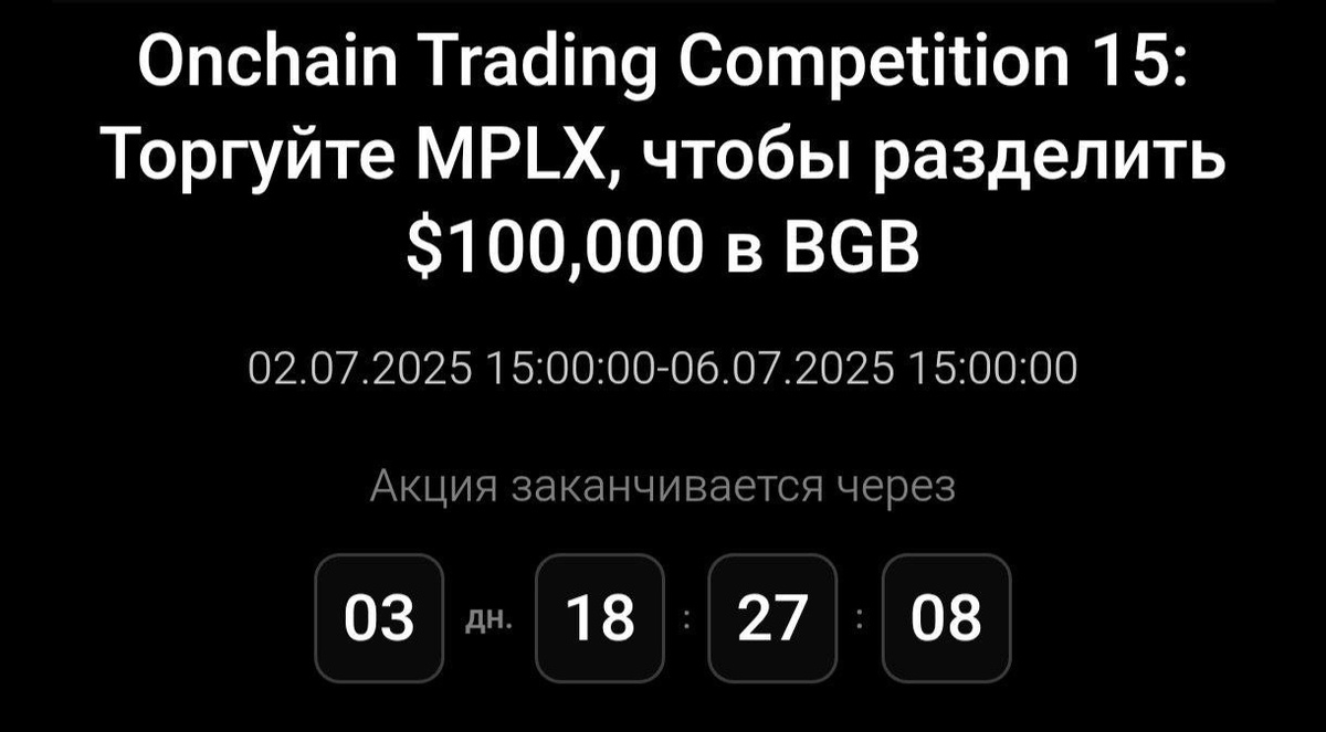 💰 Лутаем 50$ на спот, если повезёт Биржа Bitget запустила очередную промку в Onchain для всех пользователей, где 2000 рандомов получат по 50$ в $BGB. Что нужно делать: 1️⃣ Регистрируемся на бирже 👉 Bitget и проходим KYC-1 (если нет аккаунта) 2️⃣ Подтверждаем участие в акции 3️⃣ Покупаем/продаём токен $MPLX в Onchain на сумму от 500$ Холдить ничего не нужно, можно сразу продать и вывестиь деньги. Рекомендую загнать несколько аккаунтов, рандомные пользователи получат награды в зависимости от последней цифры в UID. 📆 Дедлайн: 6 июля 👉Bybit (https://partner.bybit.com/b/43818) | Chat | Admin