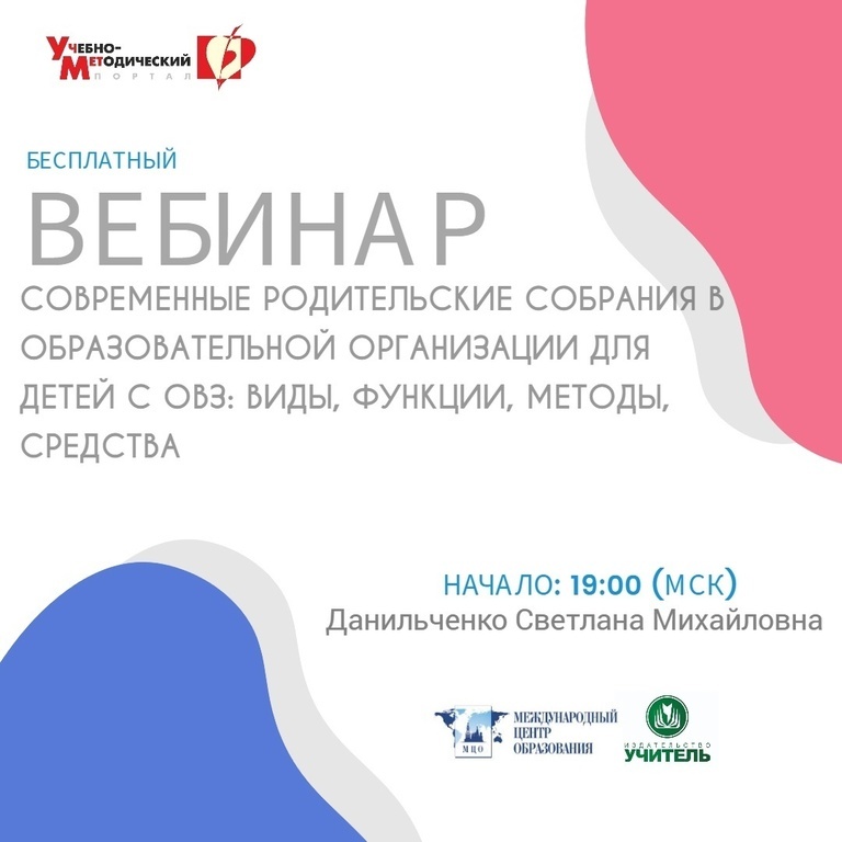 Вебинар «Современные родительские собрания в образовательной организации для детей с ОВЗ: виды, функции, методы, средства» Дата проведения: 03.07.2025 Начало: 19:00 (МСК) https://www.uchmet.ru/events/item/3882372/ Родительское собрание – это группа людей, объединенная для совместного решения проблем и задач адаптации, обучения, развития и воспитания своих детей. Она создана для оказания помощь учебному заведению, а главное – своим детям. Родительское собрание – это универсальная форма работы, так как позволяет реализовывать множество функций. Оно будет эффективным, если ориентироваться на ресурсы родителей как интеллектуальные, так и эмоциональные. Вебинар напомнит про фазы, типы реагирования в семье на появление ребенка с ОВЗ и про модели воспитания в семьях с детьми с ОВЗ; остановится на функциях родительских собраний, направлениях подготовки к ним; предложит классификацию форм проведения и сформулирует задачи. Ведущий вебинара опишет основные формы родительских собраний и даст