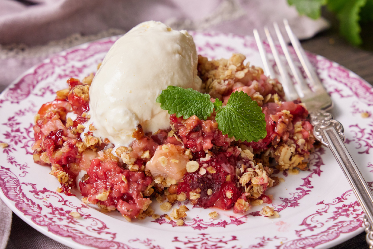 3. Выложить ягоды с ревенем в форму для запекания, сверху равномерно распределить овсяно-ореховую смесь.