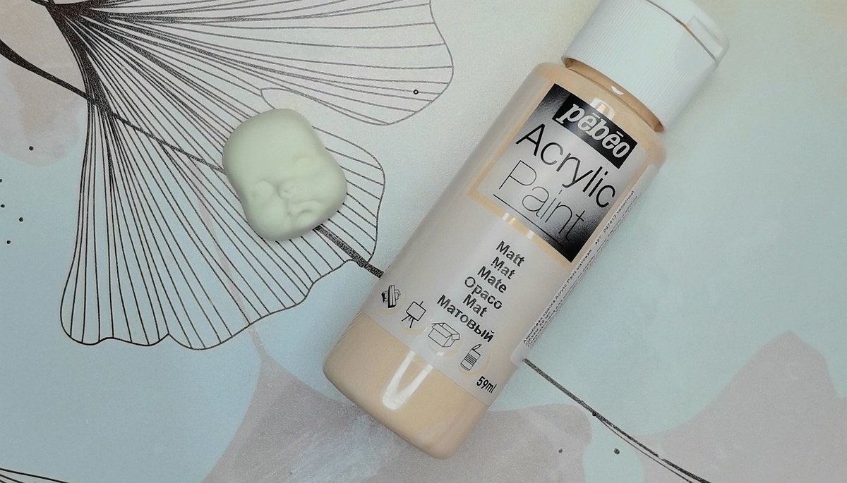 Начинаю с нанесения базового тона. Покрываю всю поверхность личика акриловой краской телесного или бежевого цвета. Краску немного развожу водой. Здесь использую толстую кисточку. Даю краске полностью высохнуть. (Листайте галерею фотографий)
