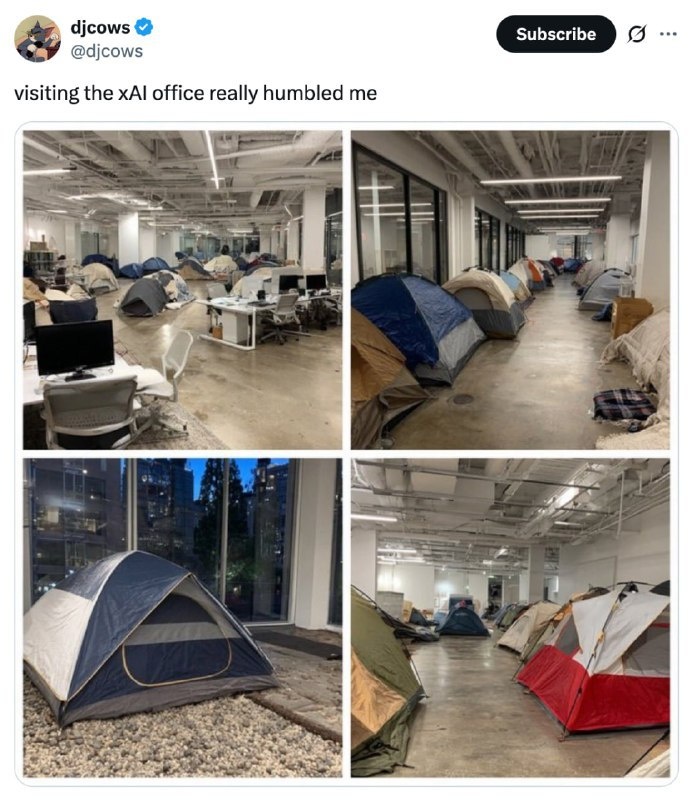 Вот так живут миллионеры: офис xAI под запуск Grok 4 превратился в целый палаточный лагерь — кадры с места уже залетают во все соцсети. Разработчики настолько ушли в работу, что спят прямо на месте, не отходя от серверов. Настоящий корпоративный туризм, по-другому не скажешь. Кто-то из xAI в шутку заявил, что это не их офис — мол, палаток должно быть раза в три больше, если бы реально все там ночевали. Подробнее: https://hard-tm.su/threads/99439/ 🕹HARD-TM — Подписаться