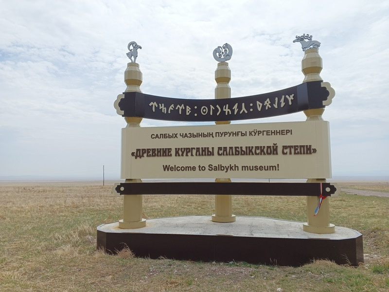 У поворота в степь с асфальта установили вот такие указатели. Похвально. Мимо не проедешь. Последний раз был здесь в июне 2021 года. Таких солидных конструкций тогда не было. Большой Салбыкский курган был построен примерно 2500 лет назад для захоронения очень важного местного партийно-хозяйственного руководителя. Раскопали курган в 1954-56 годах. Археологи, взявшись за такую трудоёмкую работу (курган был 11 метров высотой и площадью 4900 кв.м.), наверняка надеялись на богатый археологический улов, но нашли лишь несколько скелетов и ножей. Ценные вещи прибрали к рукам лихие люди с кистенями под полой ещё сотни лет назад. Так выглядел курган в стародавние времена. Считается, что изначально он имел пирамидальную форму. Раскопанный курган являетс