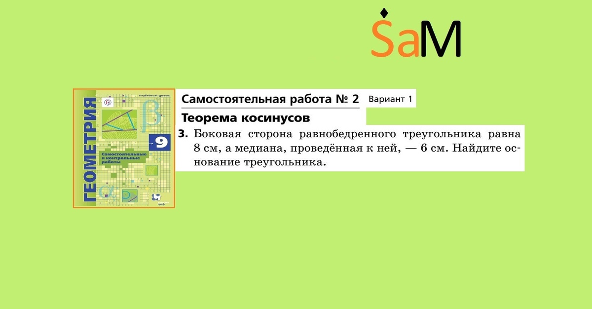 Геометрия 9 класс. Углубленный уровень. Мерзляк. Самостоятельная работа 2. Вариант 1. Задание 3 ТЕОРЕМА КОСИНУСОВ. 3. Боковая сторона равнобедренного треугольника равна 8 см, а медиана, проведённая к ней,- 6 см. Найдите основание треугольника. Для дальнейшего развития канала и публикаций бесплатного контента жмите чаще “в топ”, ставьте палец вверх и кликайте на подписку ❤️ Мои каналы: Rutube,YouTube,Vkвидео