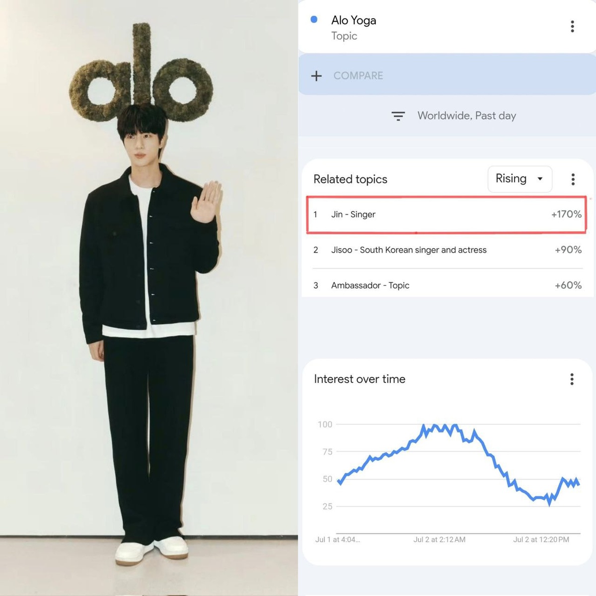 🥕 Согласно Google, глобальный амбассадор Alo, Джин, сейчас является самой обсуждаемой темой и лидирует в поисковых запросах