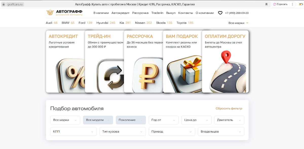 АвтоГрафф — это автосалон в Москве. Занимается продажей подержанных автомобилей. В качестве владельца в футере сайта указана компания, обладающая некоторыми признаками подставного юридического лица. В сети мы обнаружили негативные отзывы о данном дилере. В каталоге автоцентра АвтоГраф представлены подержанные автомобили. Внимание покупателей привлекают не только широким выбором, но и низкими ценами. Пример актуального прайса на момент написания статьи: Конечно, хочется верить в такой ценник. Поэтому в салон и стремятся покупатели не только из города, но и близлежащих (а иногда и не «близ») населенных пунктов. Но в самом салоне они сталкиваются с рядом условий: В конечном итоге внимание людей сосредоточено на куче документов и они теряются в том, что подписывают. Как следствие, завышение ценника по отношению к рынку. К тому же речь идет о БУ-автомобилях. Если верить этому ценнику, то сразу возникает вопрос — а что с этими автомобилями не так? К тому же в открытом доступе нет информации