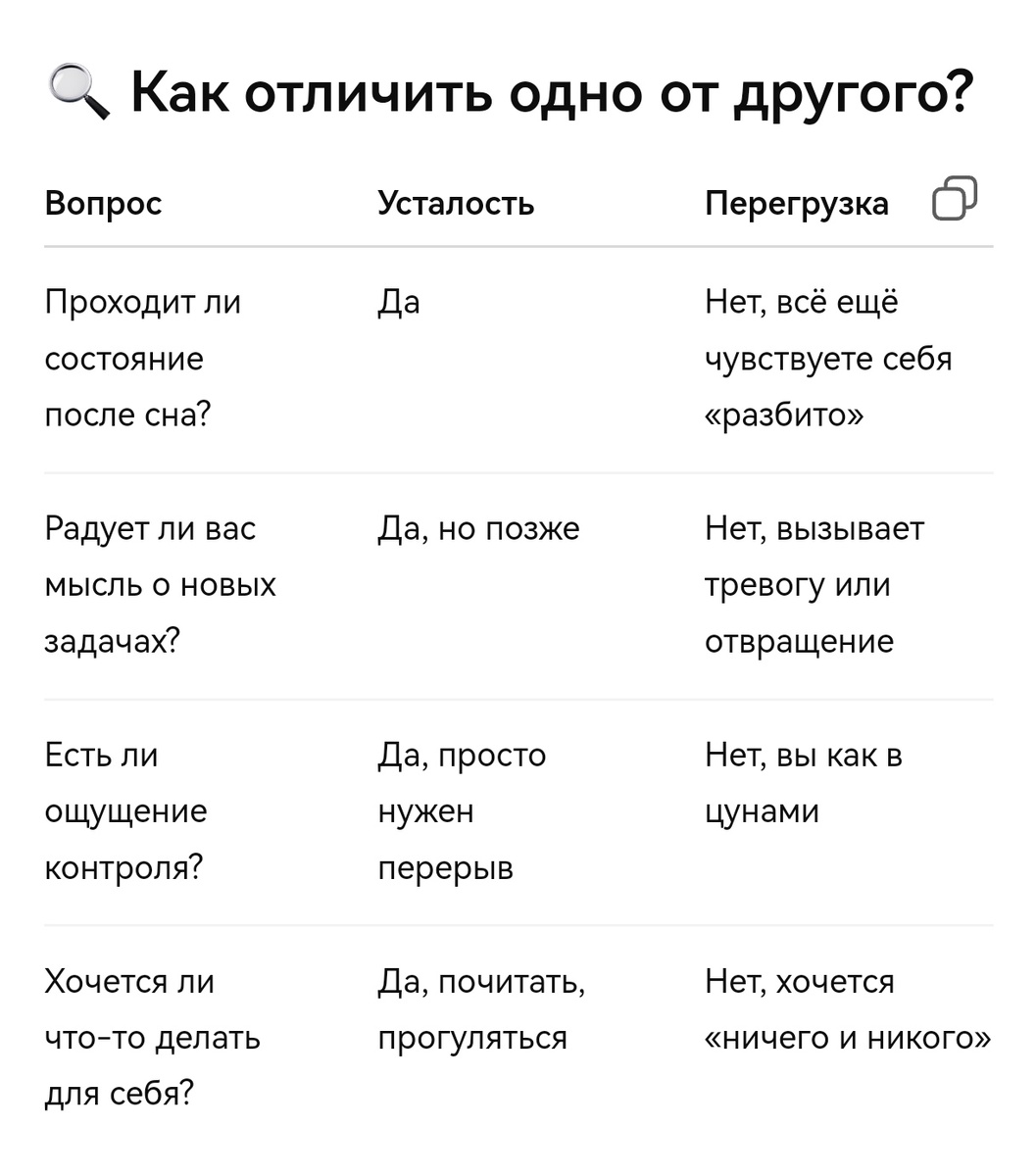 Представьте себе аккумулятор. Он может просто разрядиться после долгого использования — это усталость. А может перегреться от постоянной перезарядки, работы без перерыва и перегрузки — это уже перегрузка. Мы часто путаем эти два состояния. Но если вы хотите жить эффективно, планировать с умом и двигаться к целям без выгорания, важно научиться различать, что с вами происходит: вы просто устали, или вы перегружены? Усталость — это естественное состояние после умственной или физической активности. Как после пробежки: мышцы гудят, дыхание сбилось, но в душе — удовлетворение. Признаки усталости: Что помогает: Подумайте о батарейке: она просто села. Ей нужно немного времени на зарядку — и всё снова будет работать как надо. Перегрузка — это когда вы не просто утомились, а исчерпали внутренние ресурсы, причем слишком долго игнорировали сигналы тела и мозга. Как компьютер, на котором открыто сто вкладок — он не просто тормозит, он уже просто не справляется. Признаки перегрузки: Что помогает: Е