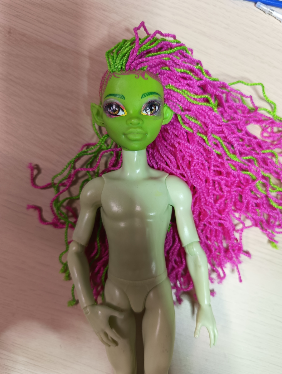 Добро пожаловать в мастерскую magic_dolls, ООАК! Сегодня расскажу о неполной переделке, которую делала уже довольно давно. Одна из моих постоянных заказчиц, София, прислала мне как-то неожиданную куклу. Ну, зелёный парень. Сразу видно, что тело взято от кого-то из старых МХ, а голова от новых G3. Причём, голова уже кем-то подпорченная - на глазах размазана краска. Положила я его в коробку, тк в это время занималась другим проектом. Но вот постоянно в моих мыслях всплывали эти волосы-веревочки. Никак не могла понять, что же в них не то. И только когда я взялась за его переделку, меня осенило. Голова то от Венеры G3! От девочки! Шейное отверстие у неё значительно меньше диаметра мужской шеи парня МХ, но натянулось. Удивительно. Очень симпатичный молд. Девочковый. Резные ушки-листочки и африканские косички на правой части головы. Нарисовать предстояло вот такого паренька, созданного ИИ со слов Софии. Она его назвала орком. Я, конечно, удивилась, могут ли быть орки такими симпатичн