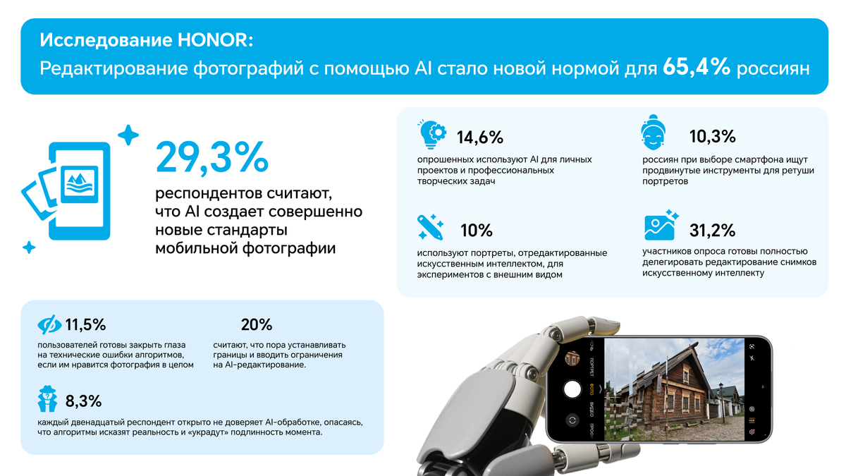 Новое исследование HONOR показало, что больше 65% пользователей смартфонов не знают, что каждый их снимок автоматически улучшается искусственным интеллектом. Многие не могут отличить фото, отредактированное ИИ, от снимков без участия алгоритмов, но при этом всего лишь 8% опрошенных беспокоятся о подлинности изображений. Опрос проведен в июне 2025 года среди более 4 000 россиян в возрасте от 21 до 54 лет, проживающих в Москве, Санкт-Петербурге, Новосибирске, Екатеринбурге, Казани, Перми, Нижнем Новгороде, Самаре, Красноярске, Омске, Ростове-на-Дону и Краснодаре. Достаточно просто нажать на кнопку, а сделать красивые фото — задача смартфона. Такое отношение характерно для большинства современных пользователей. Опрос выявил любопытное противоречие: 25% пользователей знают, что в их смартфонах есть ИИ-режимы, но понятия не имеют, как именно алгоритмы преображают их снимки за доли секунды. Искусственный интеллект работает так аккуратно, что стал невидимкой — пользователи получают результат