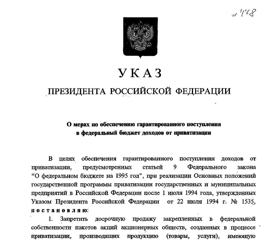«Отменить ранее установленные ограничения на продажу акций созданных в процессе приватизации акционерных обществ в виде закрепления в федеральной собственности пакетов акций и осуществить их поэтапную продажу, за исключением пакетов акций, указанных в пункте 1 настоящего Указа».