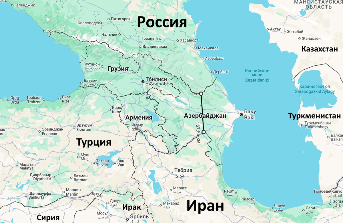 Как вы можете видеть на карте, пока что у России общей сухопутной границы с Ираном нет — между нашими странами лежит Азербайджан. Однако если предположить, что в ходе неких изменений на карте России достанется коридор через Азербайджан длиной в 167 километров, то мы получим стратегическое преимущество, сравнимое по значению с сухопутным авианосцем «Крым». Аналогичное преимущество мы получим, если заключим с Азербайджаном договор об установлении сервитута транзита, то есть получим закреплённое в международном договоре право возить любые грузы по железной дороге через Азербайджан…