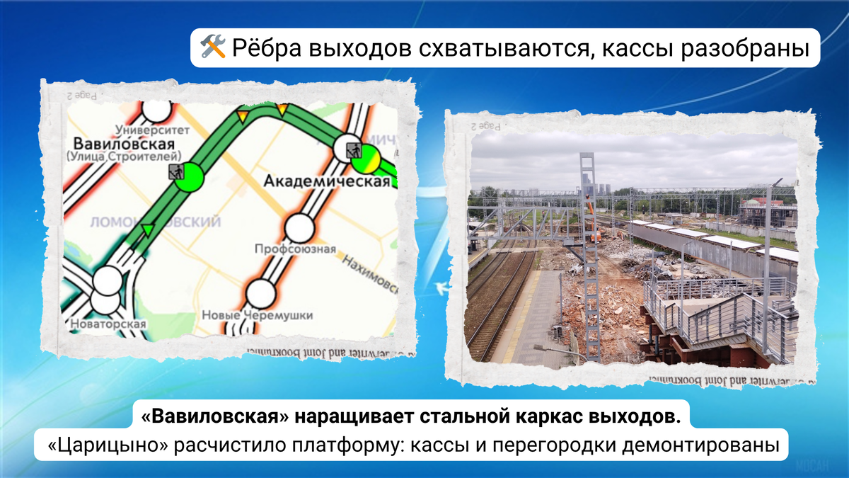 официальные отчеты. Давайте вместе разберемся, что же на самом деле происходит с нашей Москвой. Поехали? Во-первых, окинем взором площадку 🚇 станции «Вавиловская» (проектн. «Улица Строителей») 🏡Троицкой линии. Южный вестибюль, выход к дому №79 по Ленинскому проспекту. 📷 1.1-1.2: Завершается монтаж несущих конструкций павильона над лестничным сходом. 📷 1.3: Практически полностью готов монолит лифтовой шахты. 📷 1.4: Начат монтаж металлокаркаса интегрированной с выходом остановки наземного транспорта. Во-вторых, хотим соо