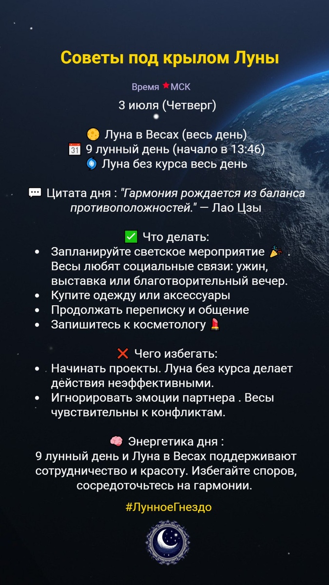🚀 03.07.2025 — число дня: 1 «Энергия первого шага и новой главы» Сегодня Вселенная даёт тебе зелёный свет — начинай! Число 1 приносит в этот день: ✔️ Энергию старта и новых возможностей ✔️ Силу принять решение и пойти первым ✔️ Поддержку в самореализации и самовыражении ✔️ Ясность — ты сам кузнец своей реальности 💎 Что делать: ✅ Начинай то, о чём мечтал ✅ Веря в себя — ты притягиваешь успех ✅ Бери ответственность и веди за собой (себя в первую очередь 😉) ⚠️ Осторожно: Избегай эгоизма и давления на других. Сила истинного лидера — в ясности, а не в контроле. 💫 Этот день — стартовая площадка твоих грандиозных планов. Готов? Тогда — вперёд!