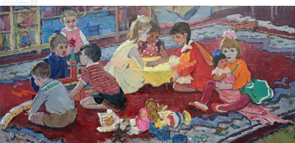 Мирошкина Тамара Алексеевна (17.09.1919, Тельма ныне Иркутской области - 1995, Красноярск). «Детский сад». 1956 год. Холст, масло; 78 х 157 см.; (Музей истории Рыбинского района, Рыбное Красноярского края).