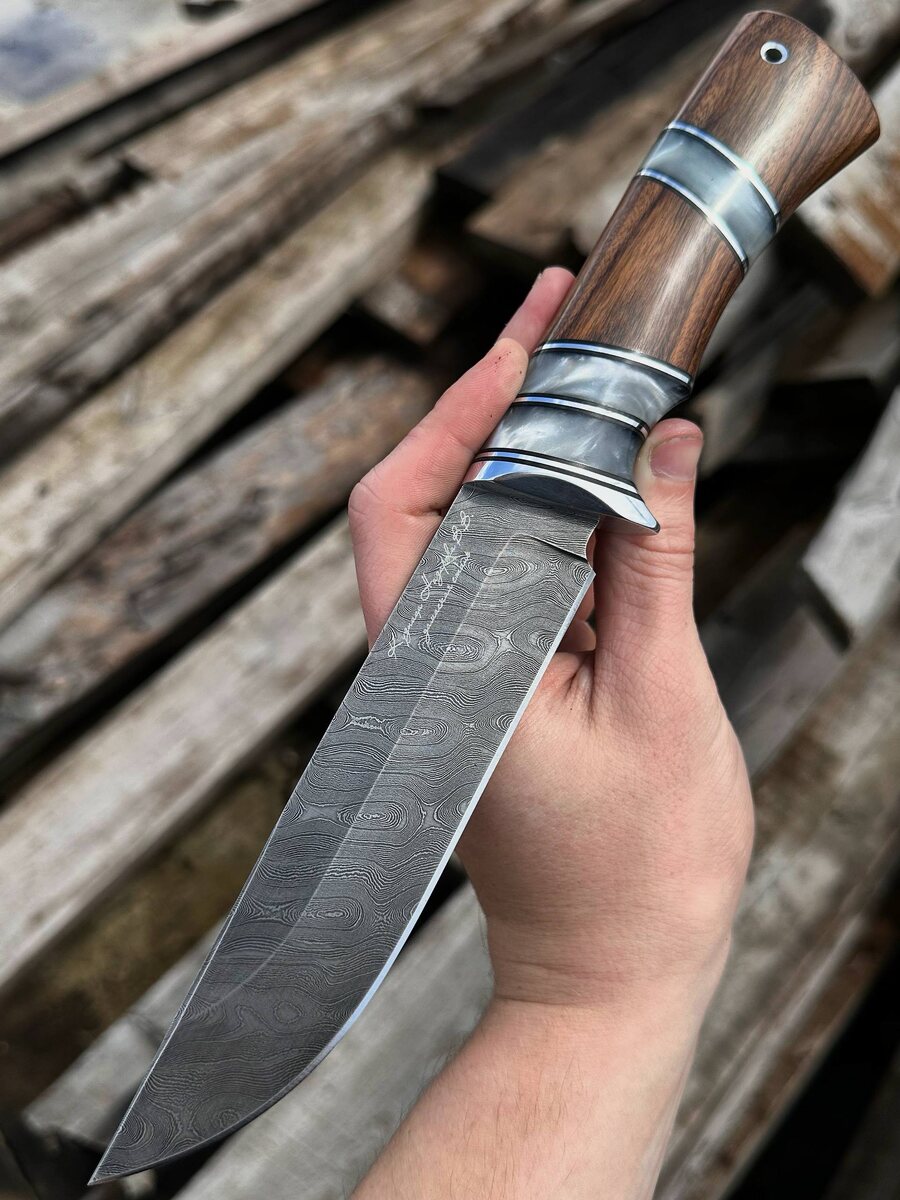 Готов охотничий нож «Овод» из дамасской стали в 950 слоев. Спуски от середины клинка, что делает нож более прочным при боковых нагрузках. Материал рукояти: палисандр и акрил белый, анатомической формы. Бритвенная заточка. Твердость клинка (HRC): 62 Цена ножа: 8.032 рубля. В комплекте идут ножны из натуральной кожи. Можем сделать формованные ножны +8000 рублей. Для заказа писать на @Nazarklinokbot или по тел +79101343831 WhatsApp/Viber