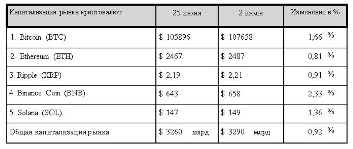 По итогам минувшего семидневного отчетного периода общая капитализация криптовалютного рынка продолжила уверенно удерживать психологическую отметку в $3 млрд. На вечер среды, 2 июля 2025 года, она составила $3,26 трлн, что на едва заметные 0,92% выше значений, зафиксированных на конец прошлого семидневного отчетного периода.