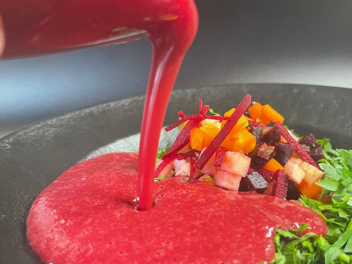 🔠🔠🔠🔠🔠🔠🔠🔠🔠🔠 Свекольник постный Жара? Прекрасный, летний холодный суп - Постный Свекольник с Вишней. В данном варианте исполнен в духе перфекционизма, но Вы можете не заморачиваться. 😁 Ингредиенты на 3-4 порции: 1️⃣ Картофель - 2 шт небольших 2️⃣ Морковь - 2 шт небольшие 3️⃣ Сельдерей - несколько тонких стеблей 4️⃣ Свёкла - 3 небольших 5️⃣ Огурцы - 3 небольших 6️⃣ Зелень 7️⃣ Вишня - 10 крупных 8️⃣ Белый кислый квас - 0,5 л 9️⃣ Чеснок - 0,5 зубчика Приготовление: 1. 2 морковки, 2 свёклы и 2 картофелины запекаем в духовке (или варим), чистим. Одну свёклу оставляем свежей. 2. Огурцы чистим. Обрезаем края овощей, чтобы получились ровные прямоугольники для красивой нарезки. Все обрезки, в том числе и от свежей свёклы, отправляем в блендер. Остальное (кроме свежей свёклы) режем аккуратными кубиками 0,5 - 0,7 см. 3. Свежую свёклу режем соломкой толщиной 2 мм. 4. Сельдерей крошим. 5. Делаем заправку. К овощам, в блендер, кладём вишню, соль, половинку зубчика чеснока и доливаем