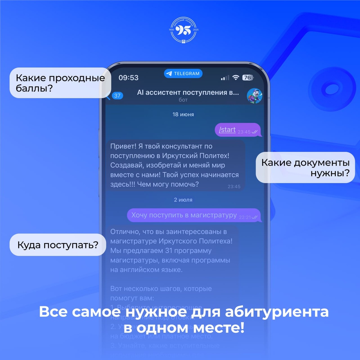 Цифровой помощник для абитуриентов от ректора ИРНИТУ 🎓 Теперь у нас появился чат-бот, который поможет каждому абитуриенту с такими вопросами как: ➡️ какие правила и сроки подачи документов? ➡️ куда поступать? ➡️ и многое другое Чат-бот не только ответит на ваши вопросы, но и подберет подходящее направления, исходя из ваших предпочтений! Чат-бот был разработан всего за три часа и сразу протестирован. Сейчас продолжается его усовершенствование с учетом запросов пользователей. ✅ Протестировать цифрового помощника можно по ссылке Также напоминанием, что в ИРНИТУ работает call-центр для обращений абитуриентов. 📞 Телефон «горячей линии»: 8 (800) 100-54-05.