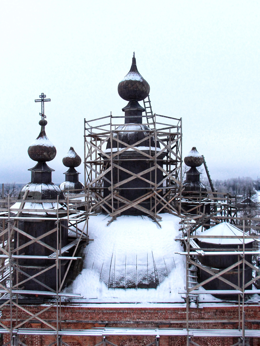 Одно из воспоминаний после подъема на колокольню восстанавливаемой церкви села Богородское (бывшее Коткишево), у меня (но, предположу, что и у многих других) – это виды на Ветлужские просторы. Было до необыкновенного спокойно, словно прошлое и настоящее слились воедино. Кроны деревьев, обдатые морозцем, застыли, оцепенев, а за ними белой петляющей лентой угадывалась река. Я уже бывала на Ветлуге, но такой истинно прекрасной она мне показалась именно в тот день. Со смотровой площадки колокольни, поверьте мне, есть куда посмотреть. По южной стороне виднеется сельская улица, по западной- мост через овражистый рельеф, теряющийся в непонятно откуда взявшемся тумане. Самое впечатляющее, по моему скромному мнению, это вид на север и восток. Мощная крыша основного объема украшена световыми башенками и главками. Придет время, установят на них железные кресты со стеклянными вставками, коих более нигде не встретить. Нынешняя каменная церковь возводилась долгие годы старанием прихожан взаме