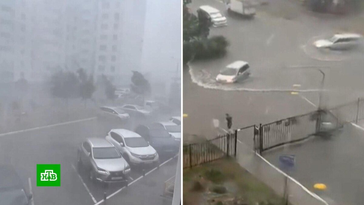 [ Смотреть видео на сайте НТВ ] Сильный дождь со шквалистым ветром добавил хлопот коммунальщикам и энергетикам Хабаровска. В городе начались перебои с электричеством. Ливневки не справились с потоком воды, мощный ливень затопил краевую столицу за 20 минут. Видимость упала практически до нуля. Осадки сопровождались сильным ветром, который повалил рекламные щиты, заборы, деревья. Пробки в городе достигли семи баллов. Повреждены электросети, отключения электроэнергии зафиксированы в трех районах. Все это происходит на фоне 30-градусной жары. Стихия затронула другие районы области и даже территорию Китая. Синоптики предупреждают, что осадки закончатся только завтра. [ Смотреть видео на сайте НТВ ]