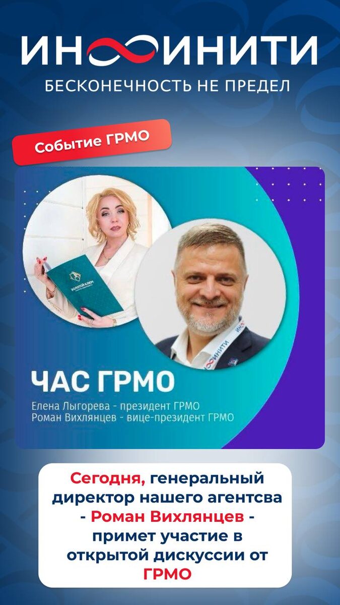 Сегодня Роман Вихлянцев - генеральный директор агентства недвижимости «ИНФИНИТИ» и вице - президент ГРМО - примет участие в открытой дискуссии от ГРМО на тему: «Агрегаторы дорожают, лиды уменьшаются: ищем выход вместе» Следим за новостями вместе ❤️💙♾️