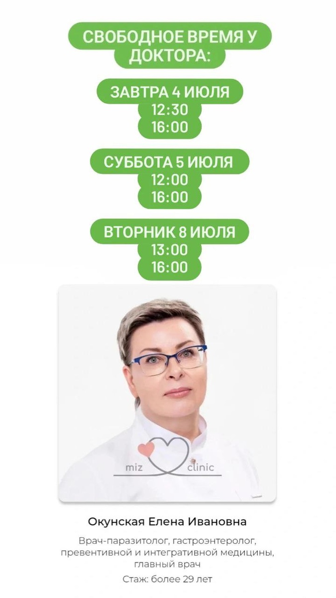 🌟 Успейте записаться к нашим специалистам ✨ Не упустите возможность получить профессиональную помощь и заботу о здоровье в Мизклиник. Звоните по номеру 8-966-040-00-54 и запишитесь на прием! 📍 Мы находимся по адресу: Улица Правды 2а. Ждем вас! 💚