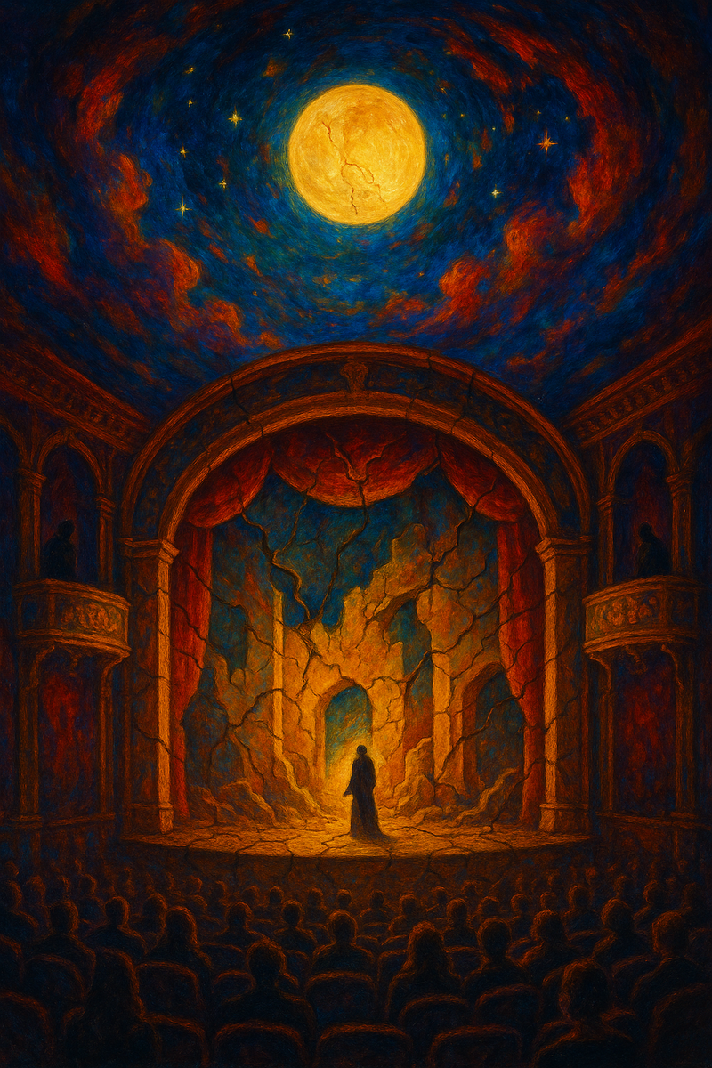 🌙 Театр Трещин До того как родиться, мы все сидим в Театре Трещин. Это странное место между мирами — зал без стен и потолка. Там — лишь безмерная ночь, сквозь которую пробиваются мерцающие огоньки чужих судеб. Каждое пламя — это чья-то прошлая жизнь, недожитая мысль, несказанное слово. Когда ты выбираешься в мир, тебе выдают маску. Говорят: «Это — ты». Но маска не подходит, натирает кожу, крошится на глазах, и всё детство ты думаешь: «Почему я — это я, а не кто-то другой?» 🎭 Жизнь как спектакль Одни старцы шепчут, что жизнь — театр, и каждый играет роль, назначенную ещё в Театре Трещин. Твоя роль — неслучайна: ты должен научиться быть этим героем до конца. Другие, более юные, смеются: «Всё можно переписать! Сцена пустая, сценарий на твоём языке». И правда — мы меняем маски по ходу пьесы. Меняем имена. Стираем границы между ролями. Может, правда где-то посередине? Может, в этой пьесе есть твоя судьба, но ты решаешь, как сыграть её — с болью или со смехом, с горькой з