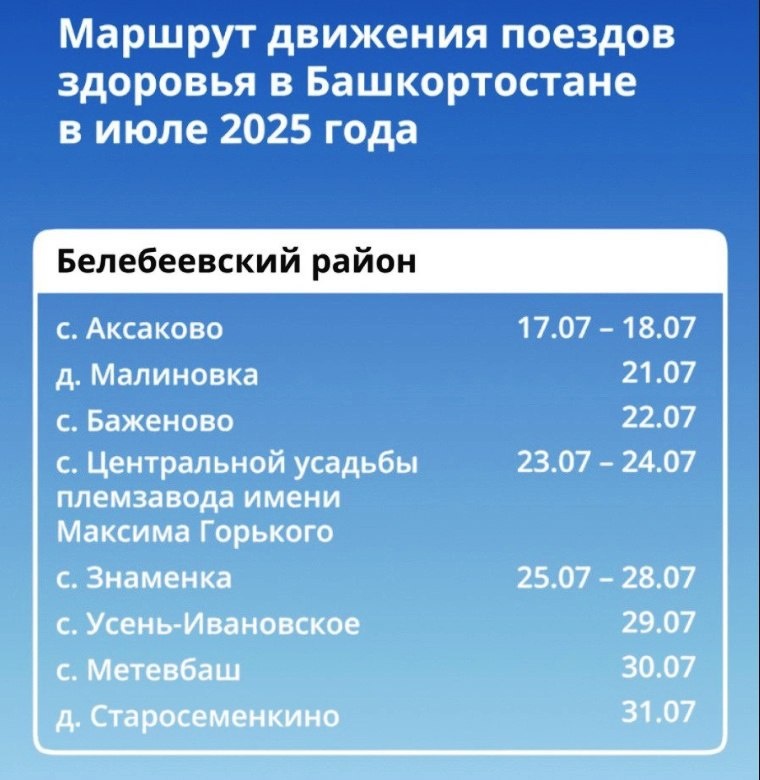 По информации Белебеевской ЦРБ «Поезд здоровья» будет курсировать по следующим населенным пунктам: