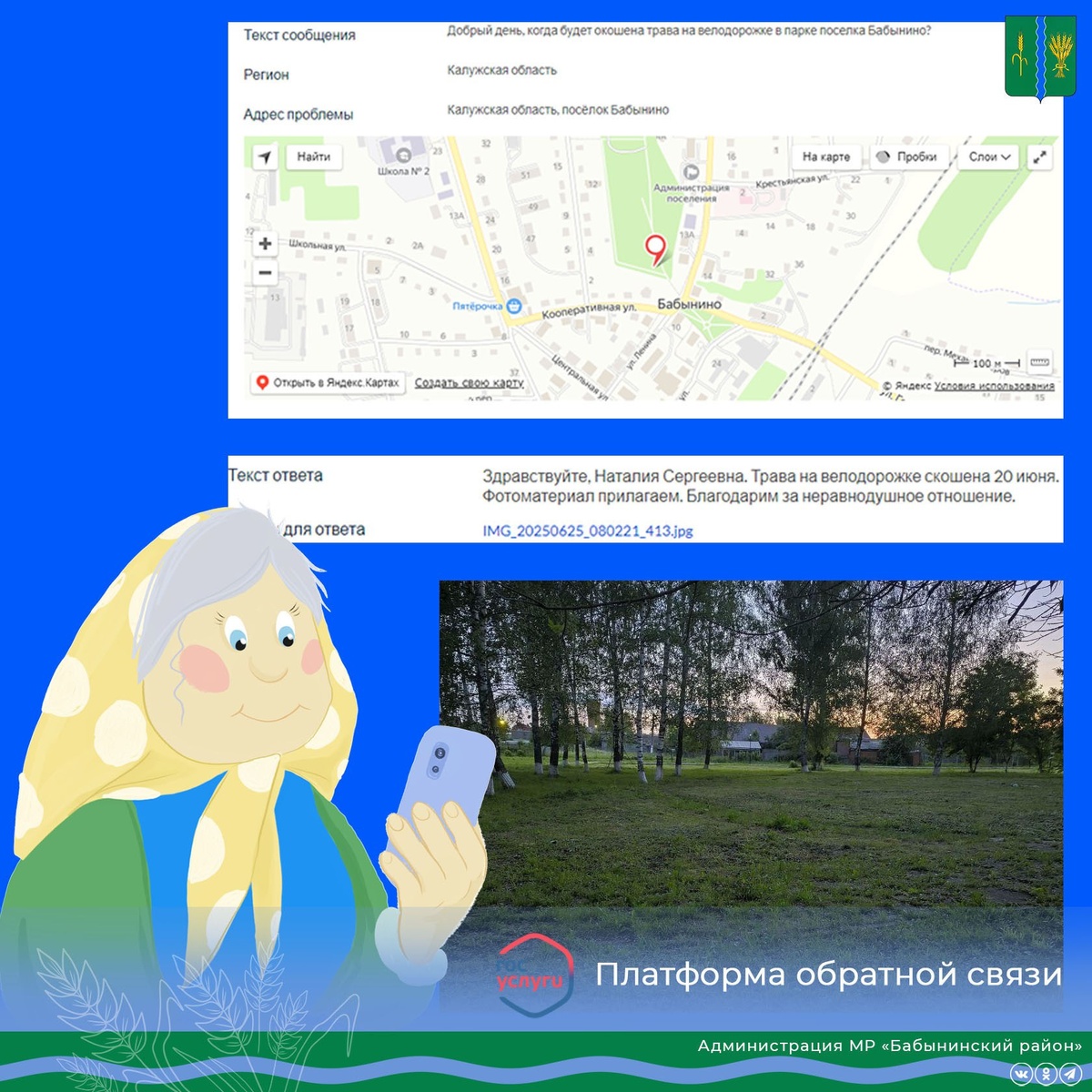 Столкнулись с проблемой? Через ПОС решать проблемы быстрее! "Когда будет окошена трава на велодорожке в парке п. Бабынино?" - с такой проблемой обратилась к нам неравнодушная жительница. Велодорожку привели в порядок - траву скосили. 📌 Через платформу обратной связи (ПОС) любой гражданин может обратиться в органы власти и местного самоуправления по широкому кругу вопросов и проблем, а также принять участие в опросах, голосованиях и общественных обсуждениях. 🔹Оставить обращение на ПОС можно по ссылке https://clck.ru/3Mo5NB. 🔹 Также доступно мобильное приложение. Скачать можно здесь: Rustore Rustore https://vk.cc/co2krs App Store https://vk.cc/c2omHV Google Play https://vk.cc/co3OK9 #Тема_дня_ПОС