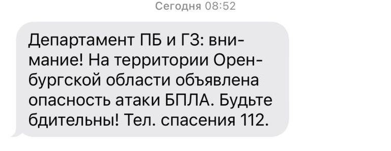 СМС с информацией об опасности беспилотников со ссылкой на оперативный штаб приходят, когда ПВО зафиксировала БПЛА, который потенциально может двигаться в сторону Оренбургской области. Это обязательный протокол безопасности.