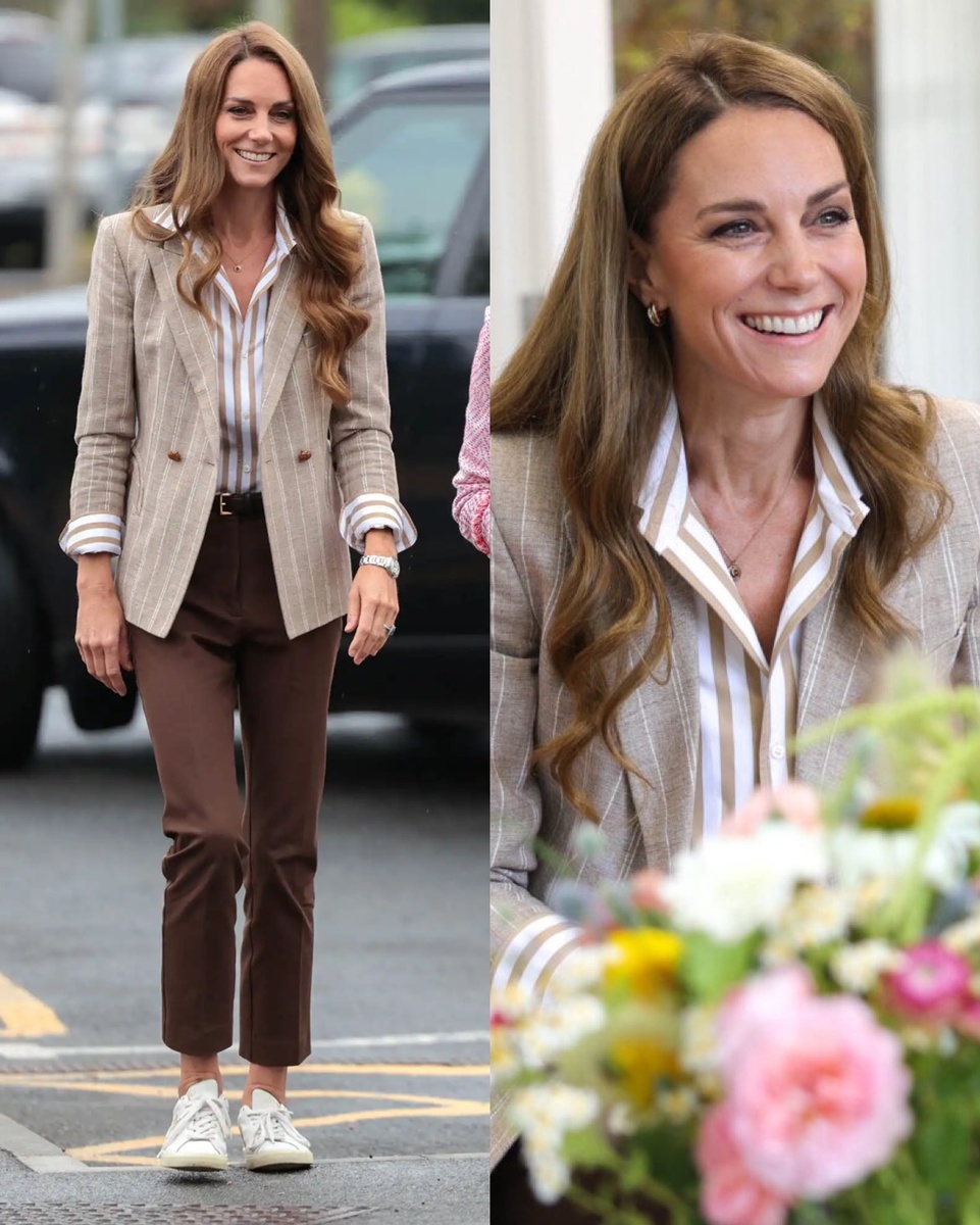 После двухнедельного перерыва Кейт Миддлтон вернулась с ярким выходом, который сразу привлёк внимание. Стильный наряд, откровения о восстановлении и прогнозы на Уимблдон — читайте о её новом этапе жизни и возвращении на публикую! Кейт Миддлтон вернулась на публику после двухнедельного перерыва, и её образ сразу привлёк внимание модных обозревателей. Принцесса Уэльская выбрала стильный и удобный наряд для визита в больничный сад в Колчестере, где она посадила розы, символизируя обновление и восстановление. Рассмотрим, как её образ отразил не только её стиль, но и важные моменты в жизни, связанные с её личным опытом. Для выхода в свет Кейт выбрала шикарный многослойный наряд, который идеально сочетал комфорт и элегантность. Она выбрала пиджак с тонкой полоской от Blaze Milano, который добавил изысканности её образу. Основу её наряда составила полосатая рубашка Ralph Lauren на пуговицах — символ классического американского стиля, сочетающий в себе элегантность и повседневность. Кроме тог