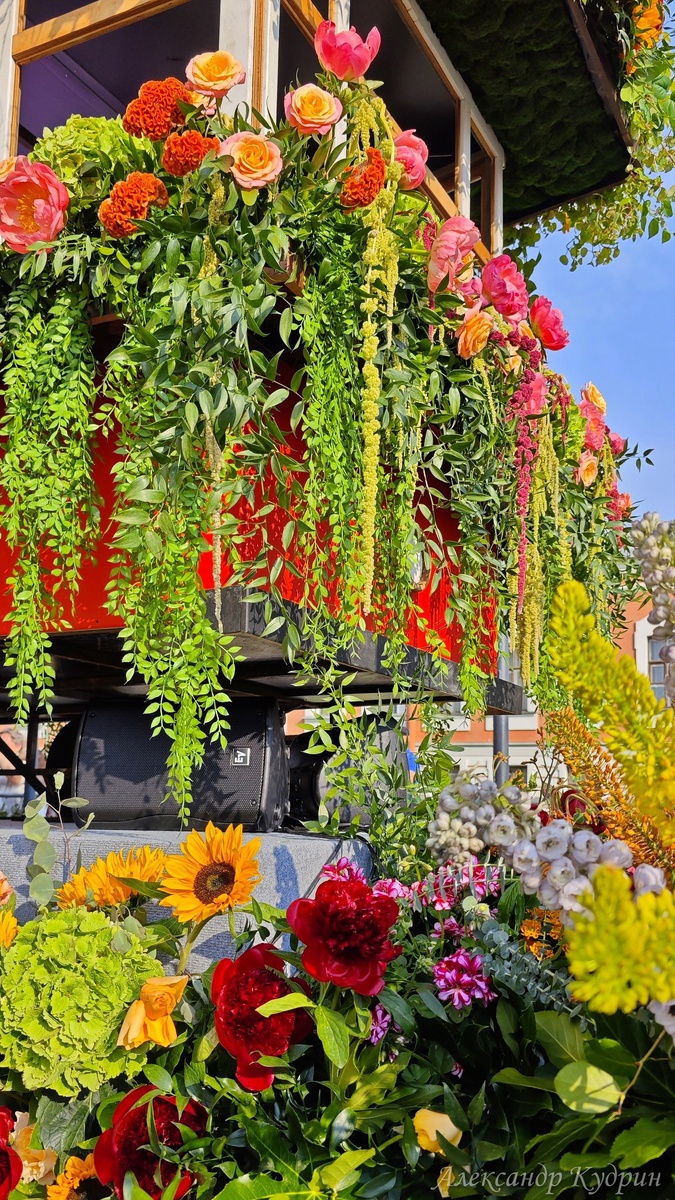 Только что мы "забили гол" цветочному "Зениту", и ноги сами понесли меня дальше к трамваю! Потому что следующая остановка на этом потрясающем фестивале цветов – это настоящий юбилейный рейс сквозь время! Встречайте платформу, от которой у любого питерца (да и просто любителя старины!) замирает сердце – "Петербургский трамвай"! И не абы какой, а посвященный 145-летию испытания первого электрического трамвая в России! Именно у нас, друзья, в этом великом городе на Неве, в далеком 1880 году, грохот конки начал уступать место тихому гулу прогресса! В 1895 году электрический трамвай пустили по льду Невы, вморозив в него рельсы, шпалы и столбы контактной сети. И вот он, красавец-вагончик! Не современный "Ласточкин" брат, а старинный, с очертаниями из позапрошлого века. Но как же он преобразился! Весь он сплошное цветочное полотно! Представьте этот цветущий вагон: Подсолнухи! Целые батареи этих солнечных гигантов! Они – как золотые блики на старинной обшивке, как само воплощение энергии, ч