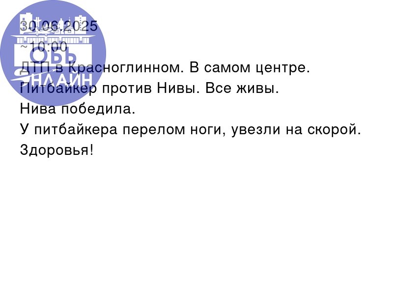 ↗ 30.06.2025 ~10:00 ДТП в Красноглинном. В самом центре. Питбайкер против Нивы. Все живы. Нива победила. У питбайкера перелом ноги, увезли на скорой. Здоровья! vk.com Подробнее на https://vk.com/ob.gorod #городобь #городобьонлайн #толмачево