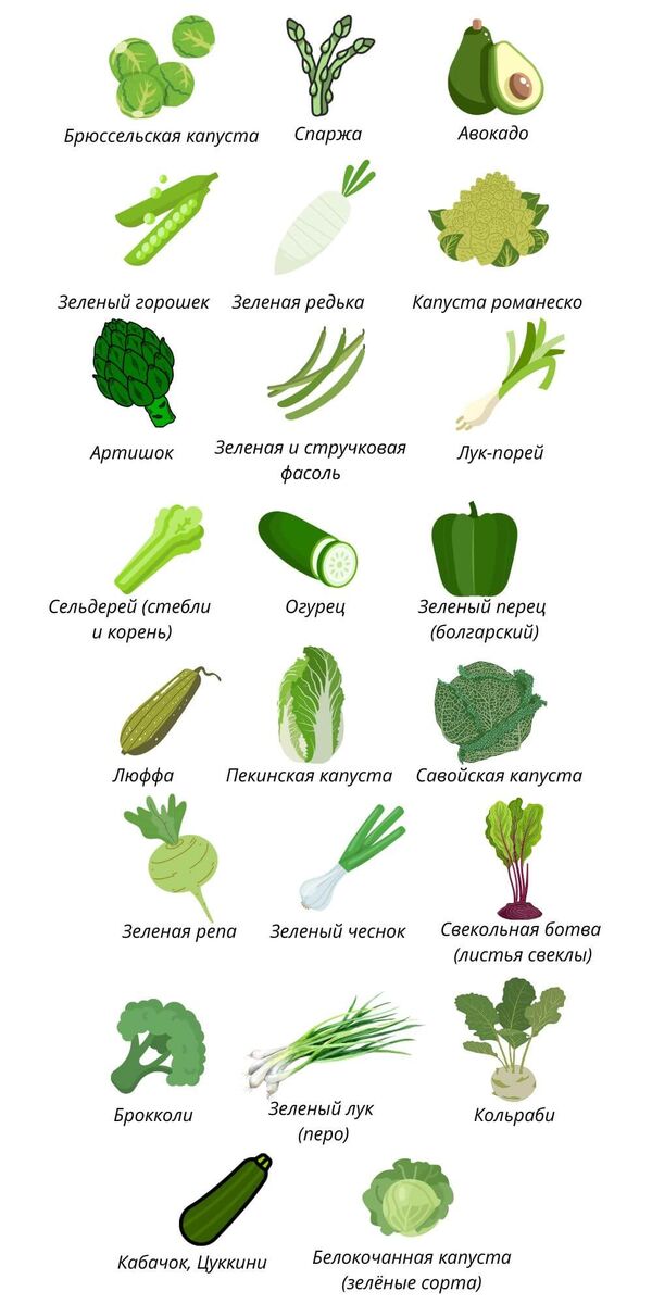 Какие бывают овощи и корнеплоды зеленого цвета смотрите на картинке: