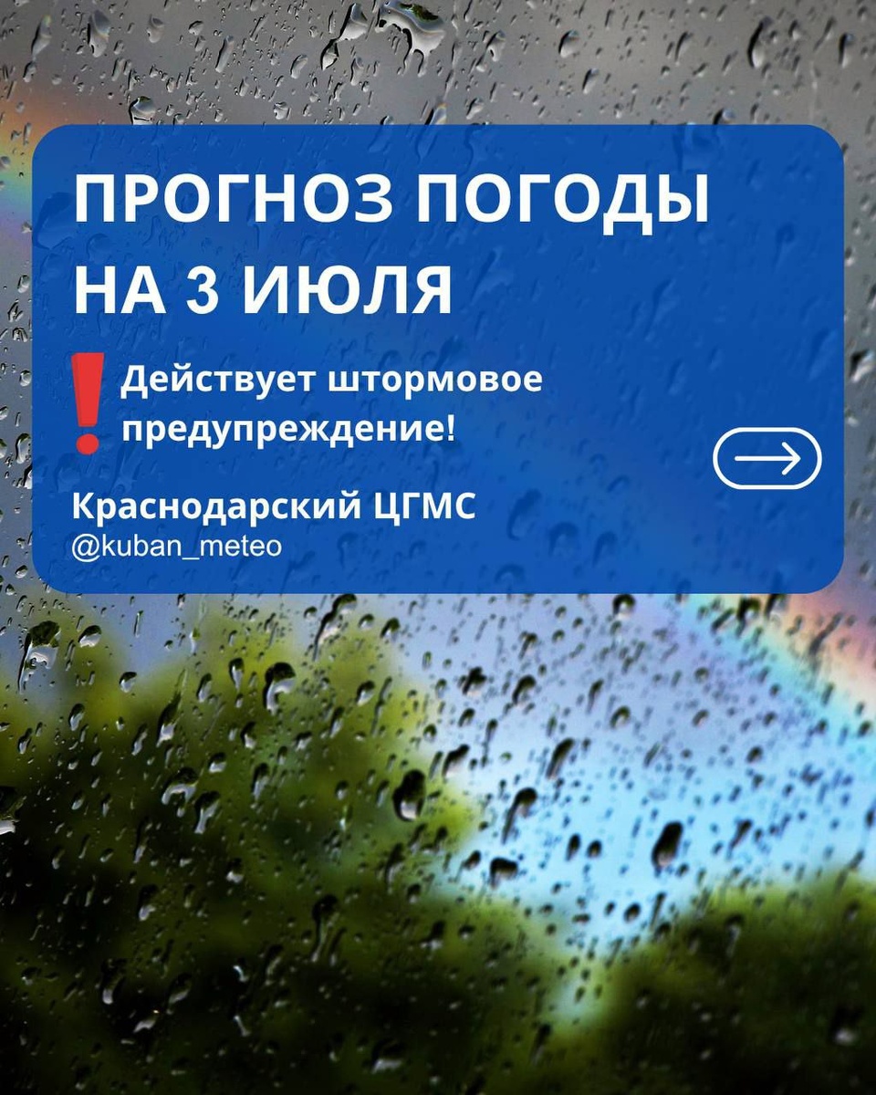 ☁️⛅⛈️ ⛈ На Кубани погода остаётся неустойчивой — характерны осадки, грозы и порывистый ветер. ⚠️ В отдельных районах ливни, град, порывы ветра до 25 м/с. 📍 По Краснодарскому краю 3 июля Переменная облачность. Местами кратковременный дождь, гроза. В отдельных районах — ливень в сочетании с грозой, град, порывы ветра 20–25 м/с (КМЯ), очень сильный дождь (ОЯ). 🌫 Ночью и утром местами — туман. 💨 Ветер западный 4–9 м/с, днём местами порывы 12–14 м/с. 🌡 Температура воздуха: • ночью +12…+17°, в юго-восточных предгорьях +8…+13°; • днём +22…+27°; • в горах ночью +3…+8°, днём +8…+13°. 🌊 На Черноморском побережье: Переменная облачность, местами кратковременный дождь, гроза. 💨 Ветер западный 4–9 м/с, местами порывы до 12–14 м/с. 🌡 Температура воздуха ночью +14…+19°, днём +20…+25°. 🏙 По г. Краснодару Переменная облачность. Ночью — без существенных осадков, днём и вечером — кратковременный дождь, гроза. 💨 Ветер западный 4–9 м/с. 🌡 Температура ночью +13…+15°, днём +22…+24°. С заботой,