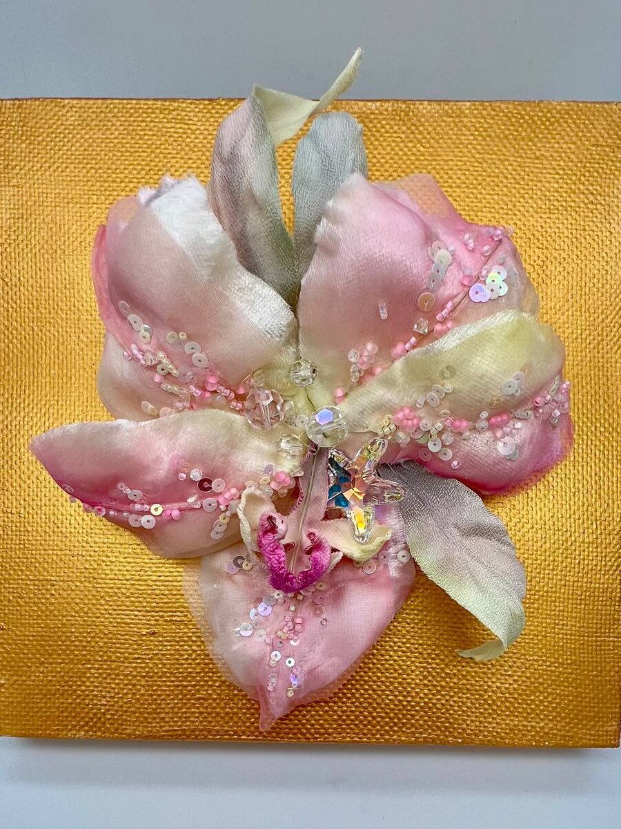 Орхидея росы Орхидея зари броши, авторская вышивка, шелк, бисер, хрусталь, пайетки ••• Особую линию на выставке представляет Елена Завражина — мастер вышивки. Она представила две броши-орхидеи, выполненные из шелка и расшитые хрустальными винтажными бусинами и бисером. При том, что это не живопись, объекты воспринимаются, как живописные, настолько ткань передает колорит цветка. Вдобавок золотые холсты, к которым прикреплены броши, создают ощущение свечения, подчеркивающее воздушность шелковых цветов. ••• Поразмышлять на тему многозначности летнего цветения можно на выставке «Цветы и лето» до 10 июля 2025. ••• Москва. Ходынский бульвар 20а, с 11:00 до 21:00 ежедневно. Выставка бесплатная, работы продаются. Вся контактная информация на сайте YOLKA.art