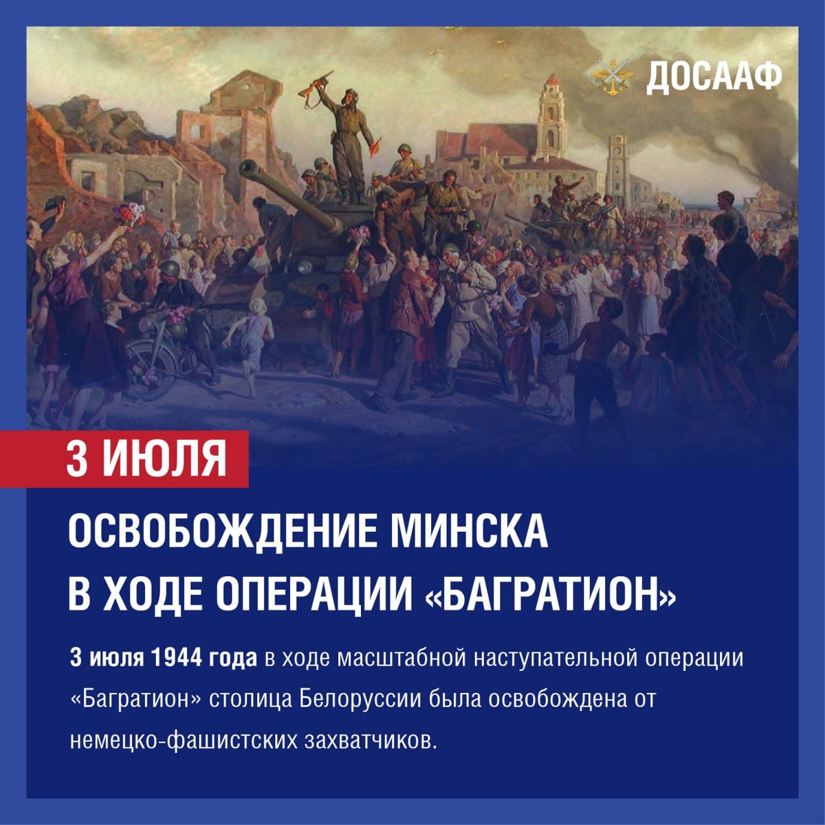 Освобождение Минска в ходе операции «Багратион» 3 июля 1944 года в ходе масштабной наступательной операции «Багратион» столица Белоруссии была освобождена от немецко-фашистских захватчиков. Этот стратегический успех стал возможен благодаря слаженным действиям 1-го, 2-го, 3-го Белорусских и 1-го Прибалтийского фронтов при поддержке партизанских соединений. Освобождение Минска ознаменовало коренной перелом в ходе боевых действий на белорусском направлении и создало условия для последующего наступления Красной Армии. В честь этого события в послевоенные годы 3 июля было установлено как День освобождения Минска, а позднее – как День Независимости Республики Беларусь. Сегодня мы отдаем дань памяти героизму советских воинов, чье мужество и самоотверженность привели к разгрому группы армий «Центр» и освобождению белорусской земли. В боях за Минск проявилось боевое братство народов СССР, ставшее залогом нашей общей Победы. ДОСААФ России продолжает хранить память о подвигах Великой Отечестве